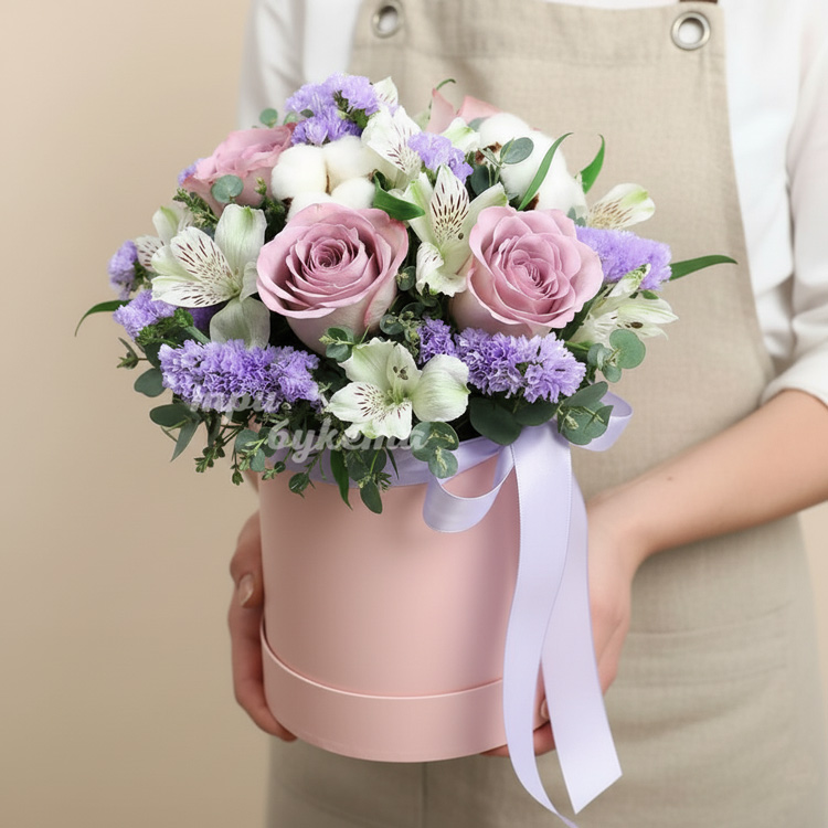 Белые альстромерии и розы в коробке