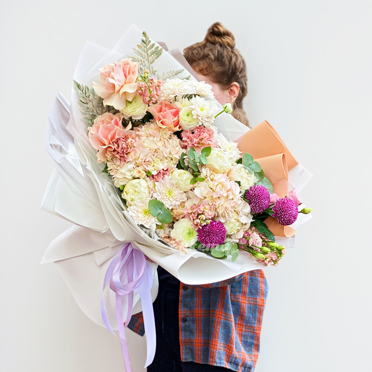 Большой букет гортензий, хризантем и роз