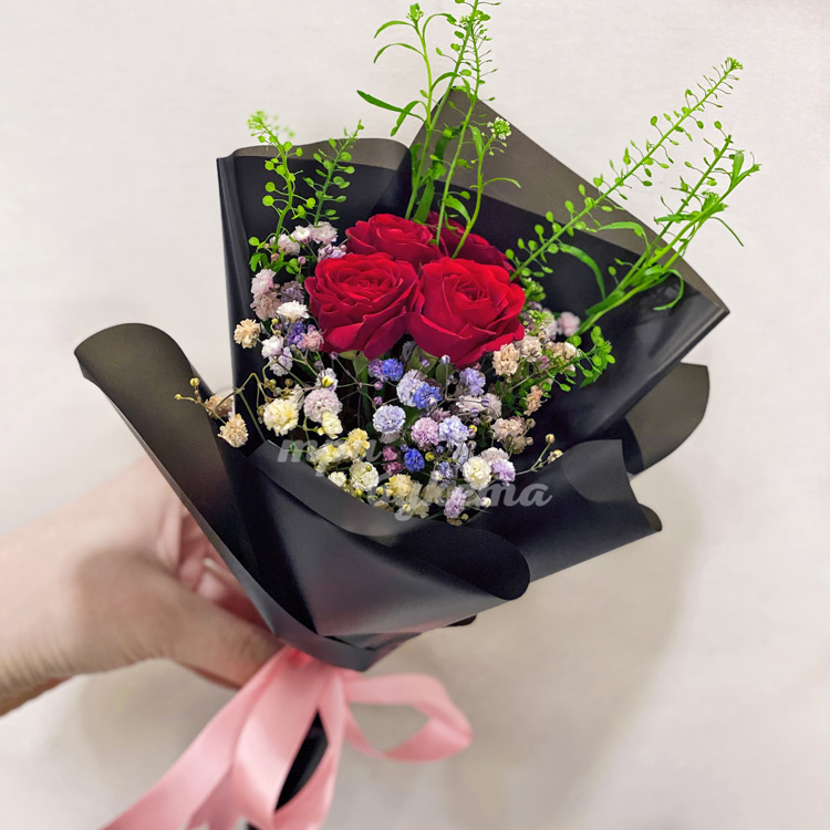 Букет из 4 роз с разноцветной гипсофилой