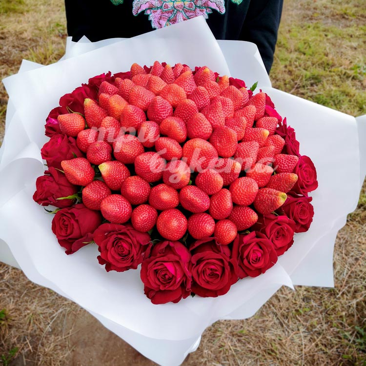 Букет из 70 ягод клубники и роз