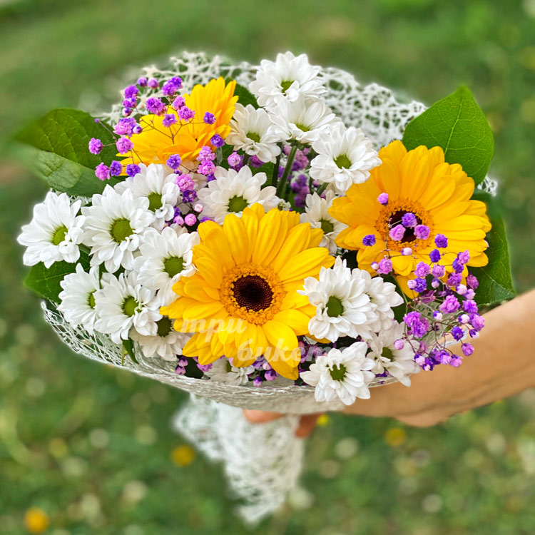 Букет из желтых гербер и белых хризантем