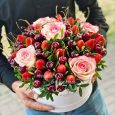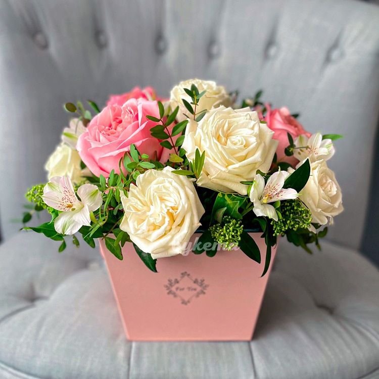 Кремовые и персиковые розы в коробке