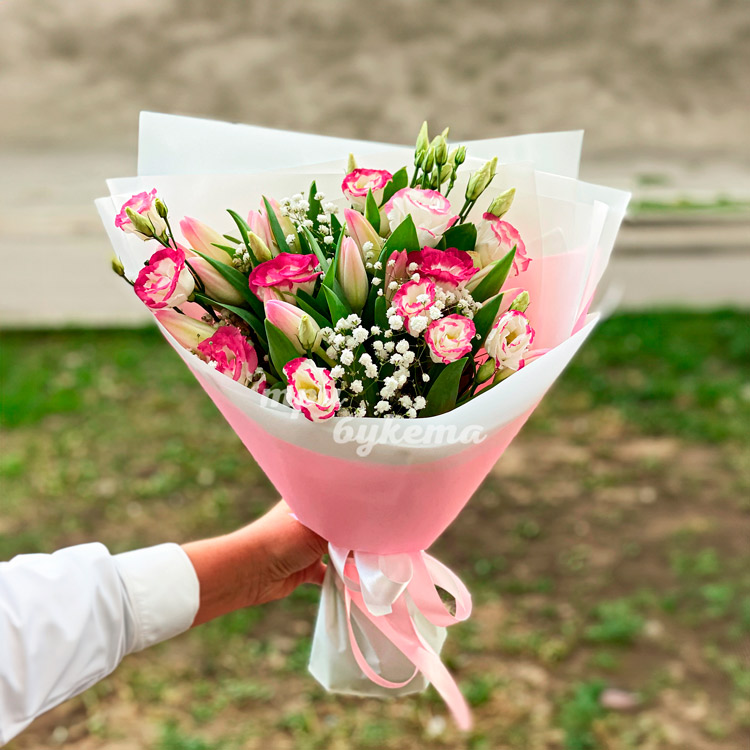 Розовый букет из тюльпанов и эустом