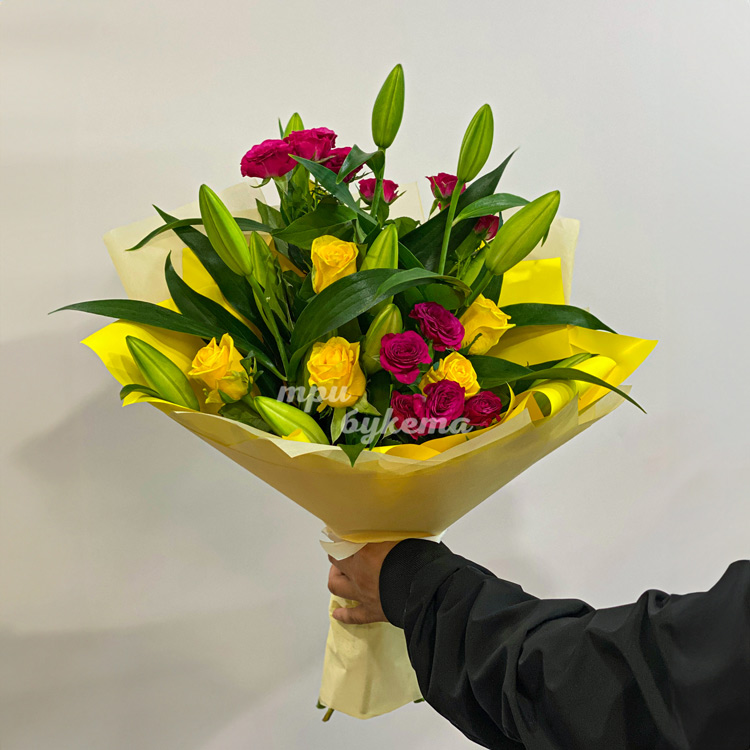 Желтый букет из роз и лилий